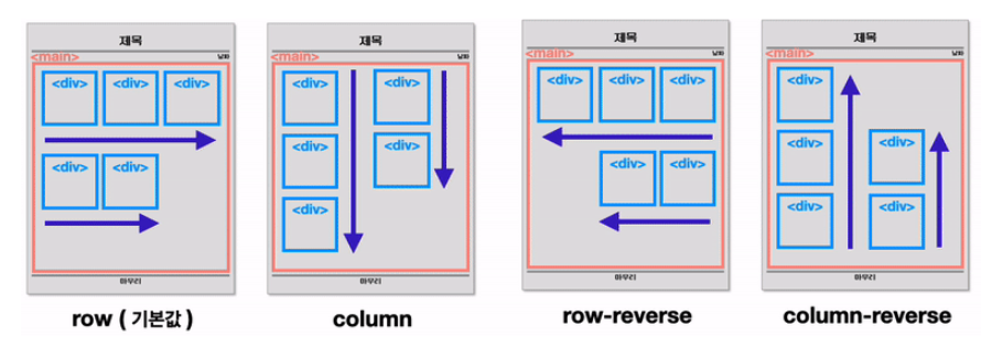 부모 요소에 설정해주는 속성으로, 자식 요소들을 정렬할 정렬 축을 정합니다. 설정 없을시 기본설정 'row'