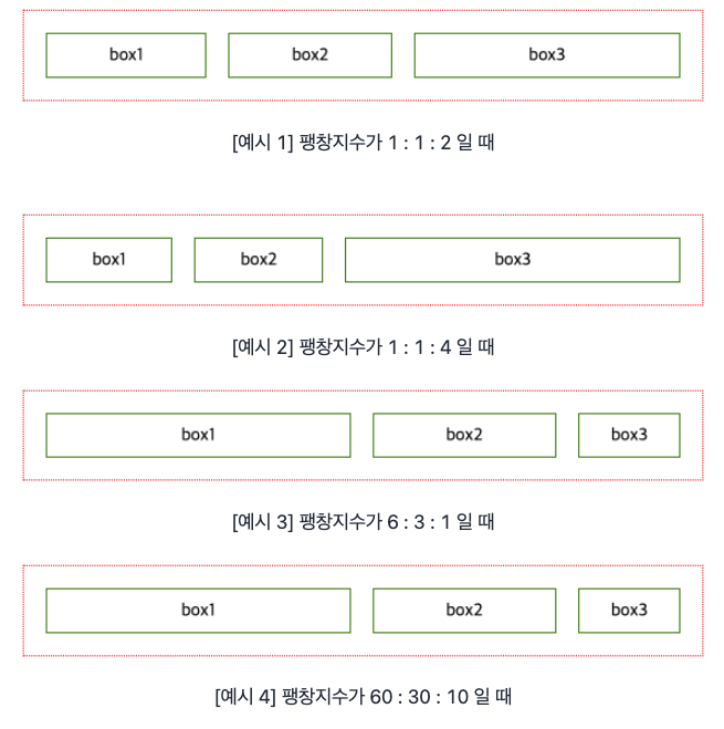 [예시 3]의 box1은 box1의 팽창지수 6 / 팽창지수의 총합 6 + 3 + 1 = 3/5 만큼의 빈 공간을 가져가고,