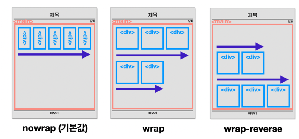 하위 요소들의 크기가 상위 요소의 크기를 넘으면 자동 줄 바꿈을 할 것인지 정합니다. 기본세팅은 nowrap (줄바꿈 없음)