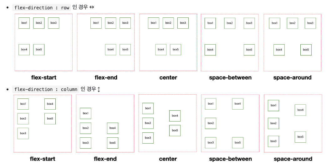 4) justify-content: row - 축 수평 방향 정렬
