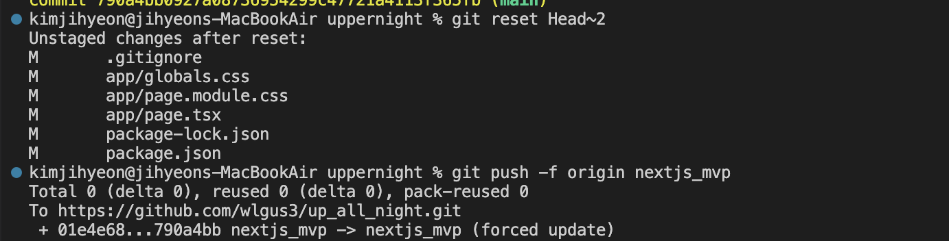 2. git reset Head~์ซ์ ๋ก ์ญ์ ํ ์ปค๋ฐ๋ด์ญ์ ์ ํํ๋ค. ์ด ๋ ๊ฐ์ฅ ์ต๊ทผ ๋ด์ญ์ด 1๋ฒ์ด๊ณ ๊ทธ ์ด์ ์ด 2๋ฒ์ด๋ค. ๋๋ ๋ณด์์ ๋ณด๋ฅผ ์ปค๋ฐํ 2๋ฒ์งธ ๊ธฐ๋ก๊น์ง ๋ชจ๋ ์ญ์ ํ๋ค.