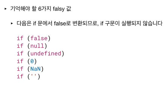 - truthy와 falsy 가 조건문에서 작동하는 방식을 이해할 수 있다.