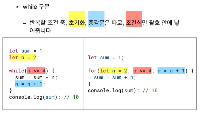 - 기본적인 for문 (for (let i = 0; i < 5; i++))을 응용하여 다양한 for문을 만들 수 있다.