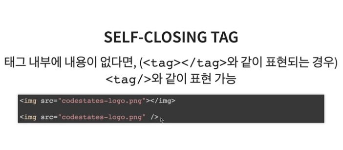 - self- closing tag ; 닫는 태그 생략된 태그