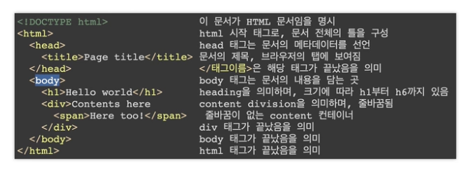 - HTML은 태그(<>로 묶인 html의 기본 요소)들의 집합
